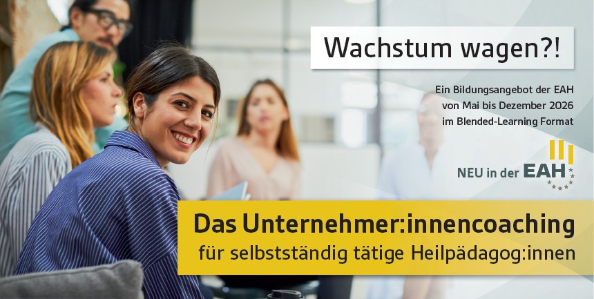 Ab dem 30. Mai 2026 startet das Unternehmer:innencoaching als EAH Angebot für selbstständige Heilpädagog:innen. Das Coaching für heilpädagogische Unternehmer:innen vereint zwei Prozesse: Die persönliche Weiterentwicklung der unternehmerischen Rolle sowie die Vermittlung von Fachinformationen zu grundlegenden unternehmerischen Fragestellungen. In dem hybriden Veranstaltungsformat mit sechs Terminen innerhalb von acht Monaten stehen diese beiden Prozesse im Mittelpunkt.